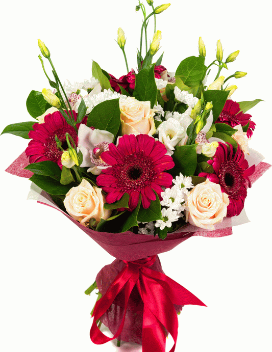 1 гербера, 1 белая орхидея, 1 лизиантус, 1 хризантема сантини, 1 кремовая роза, салал, упаковка, лента3 вишневых герберы, 2 белые орхидеи, 3 лизиантуса, 2 хризантемы сантини, 2 кремовых розы, салал, упаковка, лента5 вишневых гербер, 5 белых орхидей, 5 лизиантуса, 5 хризантем сантини, 5 кремовых роз, салал, упаковка, лента