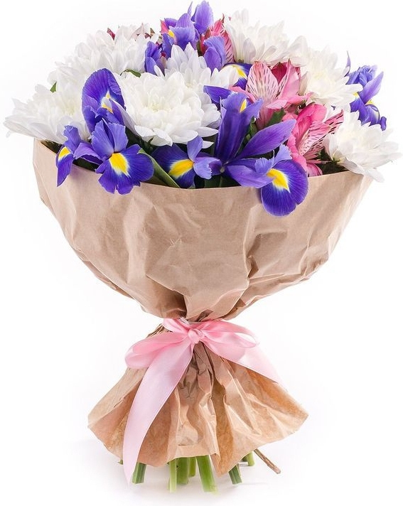 1 синий ирис, 1 белая хризантема, 1 розовая альстромерия, упаковка, лента3 синих ирисов, 2 белых хризантем, 2 розовых альстромерий, упаковка, лента5 синих ирисов, 2 белых хризантем, 3 розовых альстромерий, упаковка, лента